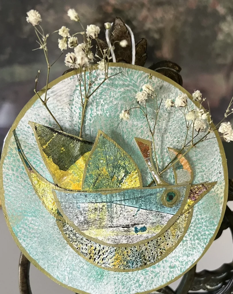 One of her favorite techniques is Gelli plate monoprinting—a playful printmaking process that produces unique, layered paintings. Karen enjoys experimenting with botanicals, stencils, and everyday objects to create texture and depth.